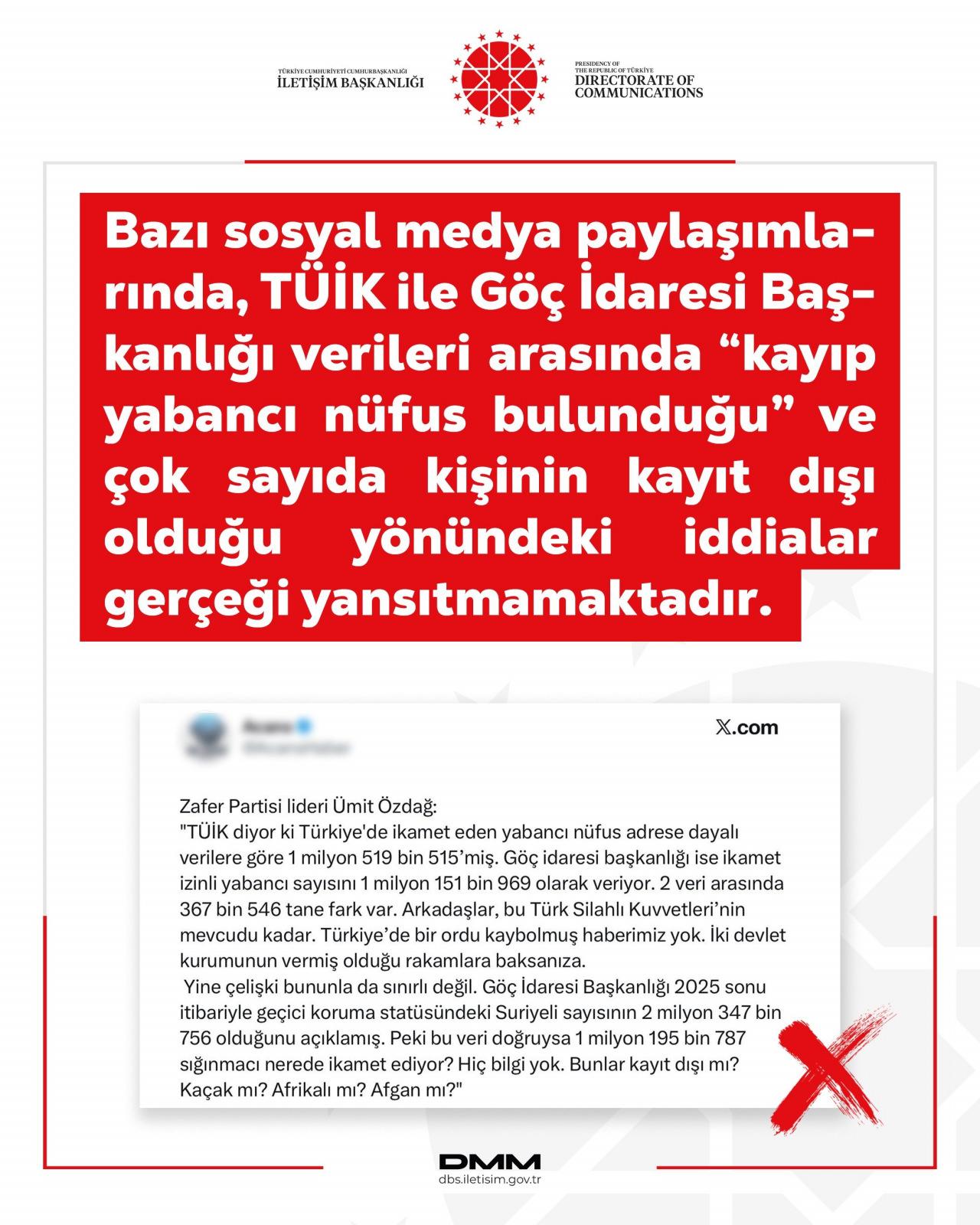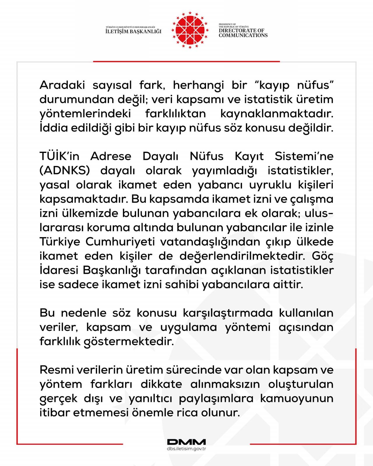 İletişim Başkanlığı Dezenformasyonla Mücadele Merkezi'nden (DMM) yapılan açıklamada, söz konusu iddiaların veri kapsamı ve yöntem farklılıklarının dikkate alınmamasından kaynaklandığı belirtildi.