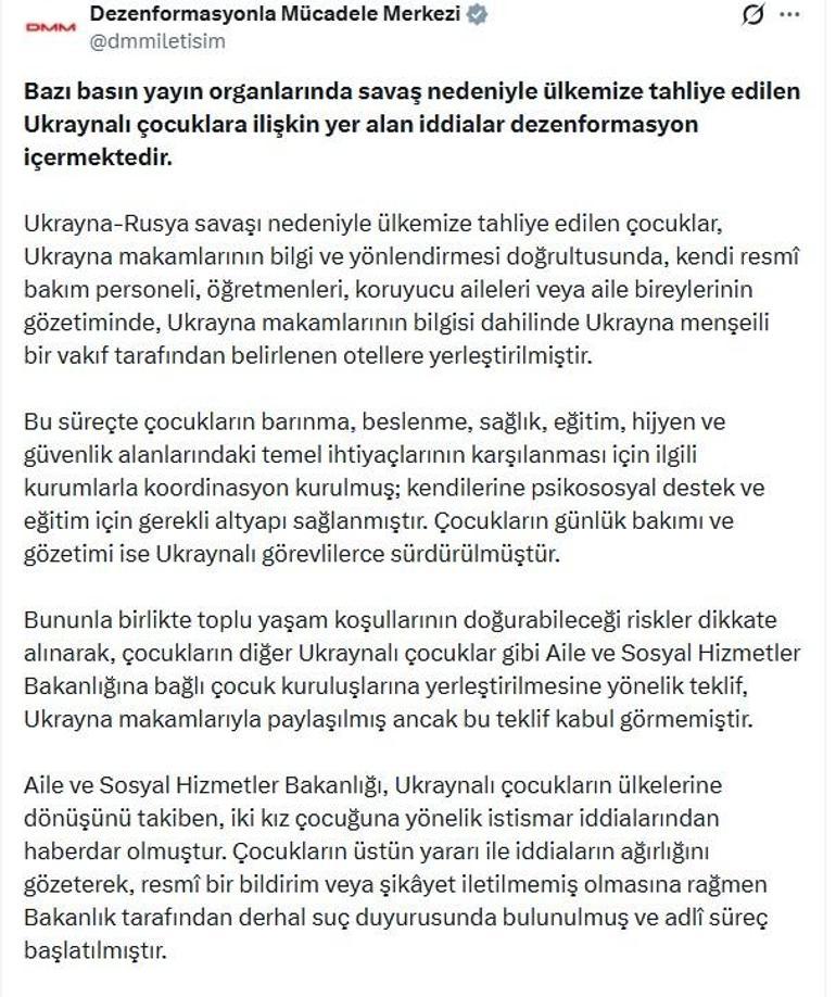 Ayrıca, çocukların diğer Ukraynalı çocuklar gibi Aile ve Sosyal Hizmetler Bakanlığı'na bağlı çocuk kuruluşlarına yerleştirilmesine yönelik teklifin, Ukrayna makamlarıyla paylaşıldığı ancak bu teklifin kabul görmediği kaydedilerek, "Aile ve Sosyal Hizmetler Bakanlığı, Ukraynalı çocukların ülkelerine dönüşünü takiben, iki kız çocuğuna yönelik istismar iddialarından haberdar olmuştur. Çocukların üstün yararı ile iddiaların ağırlığını gözeterek, resmi bir bildirim veya şikayet iletilmemiş olmasına rağmen Bakanlık tarafından derhal suç duyurusunda bulunulmuş ve adli süreç başlatılmıştır. Haberde Türkiye’nin çocukların korunmasına ilişkin yükümlülüklerini yerine getirmediği yönünde oluşturulmaya çalışılan algı, gerçeği yansıtmamakta ve kamuoyunu yanıltmaya yönelik manipülatif bir dezenformasyon örneği teşkil etmektedir. Aile ve Sosyal Hizmetler Bakanlığı, Ukrayna makamlarıyla iş birliği içinde, ulusal ve uluslararası yükümlülükleri çerçevesinde, savaş mağduru tüm çocukların korunması için gerekli tüm adımları atmayı sürdürmektedir. Kamuoyunun, manipülatif içeriklere itibar etmemesi önemle rica olunur" ifadelerine yer verildi.