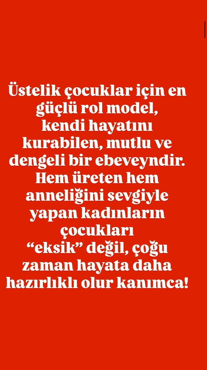Doğa Rutkay Kamal, sözlerine şöyle devam etti; "Üstelik çocuklar için en güçlü rol model, kendi hayatını kurabilen, mutlu ve dengeli bir ebeveyndir. Hem üreten hem anneliğini sevgiyle yapan kadınların çocukları 'eksik' değil, çoğu zaman hayata daha hazırlıklı olur, kanımca." ifadelerini kullandı.
