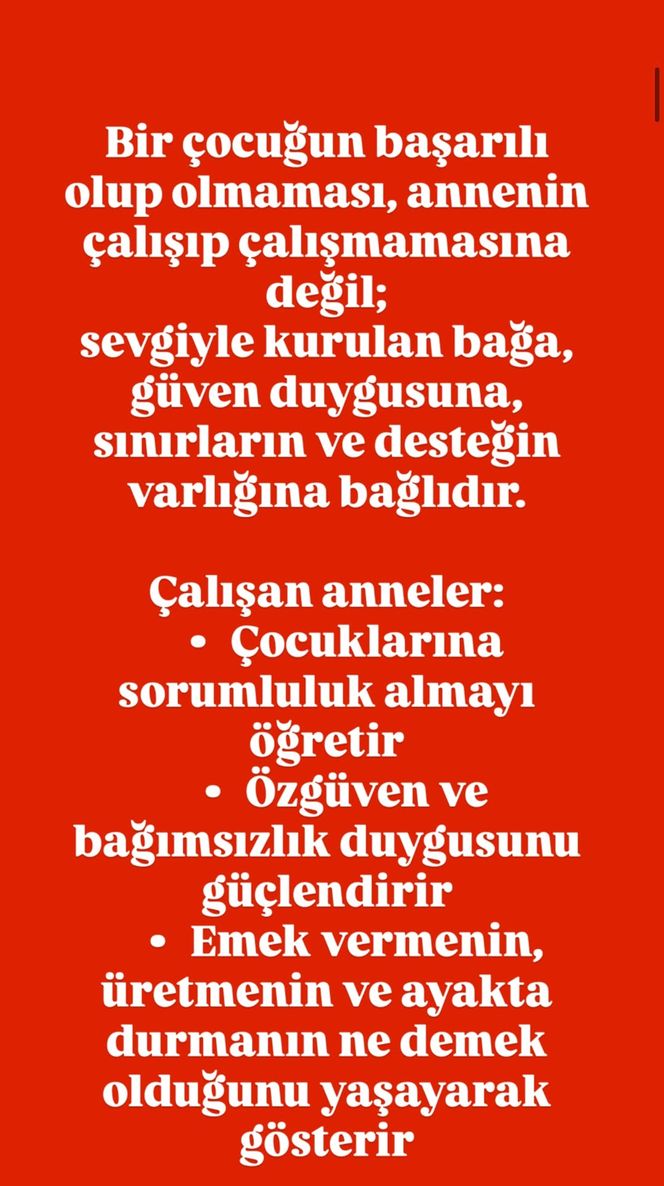 Doğa Rutkay Kamal, paylaşımında şu ifadelere yer verdi; "Bir çocuğun başarılı olup olmaması, annenin çalışıp çalışmamasına değil; sevgiyle kurulan bağa, güven duygusuna, sınırların ve desteğin varlığına bağlıdır. Çalışan anneler ise çocuklarına sorumluluk almayı öğretir, özgüven ve bağımsızlık duygusunu güçlendirir; emek vermenin, üretmenin ve ayakta durmanın ne demek olduğunu yaşayarak gösterir."