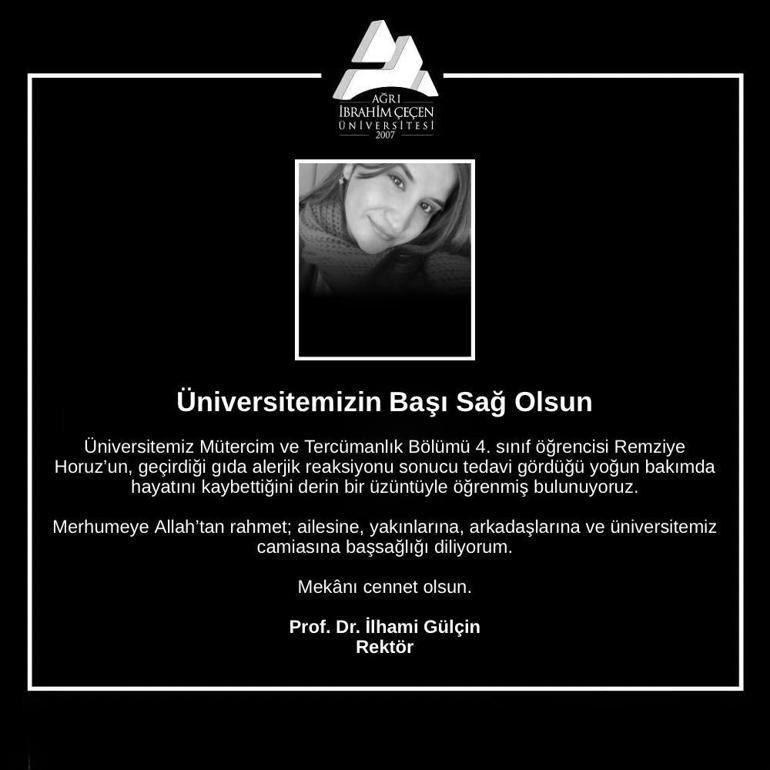 Gülçin, mesajında "Üniversitemiz Mütercim Tercümanlık Bölümü 4. sınıf öğrencisi Remziye Horuz'un geçirdiği gıda alerjik reaksiyonu sonucu tedavi gördüğü yoğun bakımda hayatını kaybettiğini derin bir üzüntüyle öğrenmiş bulunuyoruz. Merhumeye Allah'tan rahmet, ailesine, yakınlarına, arkadaşlarına ve üniversitemiz camiasına başsağlığı diliyorum. Mekanı cennet olsun." ifadelerini kullandı.