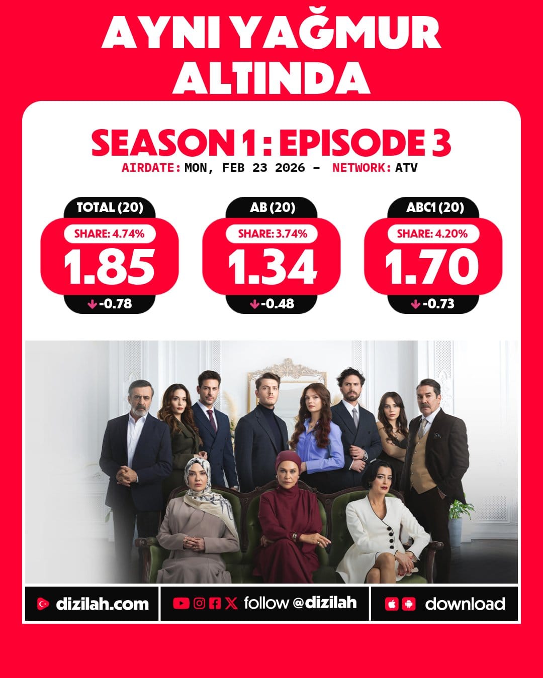 Aynı Yağmur Altında dizisi, geçtiğimiz hafta ekrana gelen "domuz eti" sahnesiyle sosyal medyada çok konuşulsa da dün akşam yayınlanan üçüncü bölüm reytinglerde dibe vurdu.