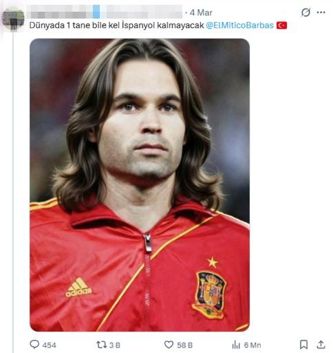 TÜRK KULLANICIDAN DİKKAT ÇEKEN PAYLAŞIMBu açıklama sonrası Türk bir kullanıcı, İspanya'ya teşekkür etmek adına sosyal medya hesabından dikkat çeken bir paylaşım yaptı. Yapılan paylaşımda eski İspanyol futbolcu Andres Iniesta'nın İspanya Milli Takımı forması ile çekilmiş bir fotoğrafını, uzun ve dalgalı saçlı bir montajla paylaştı. Paylaşılan fotoğrafa "Dünyada tek bir kel İspanyol bile kalmayacak." ifadelerini ekleyen sosyal medya kullanıcısının bu esprili sözleri büyük dikkat çekti.