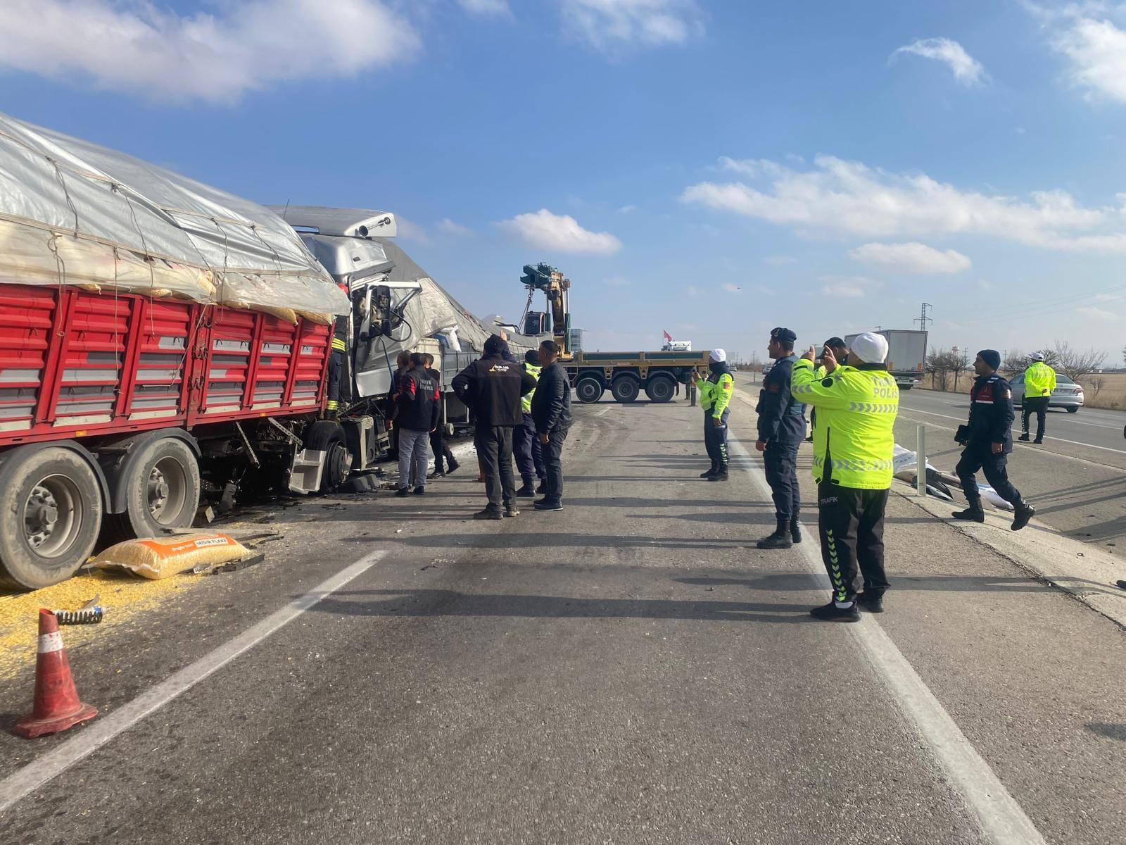 TIR'ın kabininde sıkışan şoförün cansız bedeninin çıkarılması için vinçle çalışma başlatıldı. Ekiplerin, sürücülerin kimliklerini belirlemek için çalışması sürüyor.