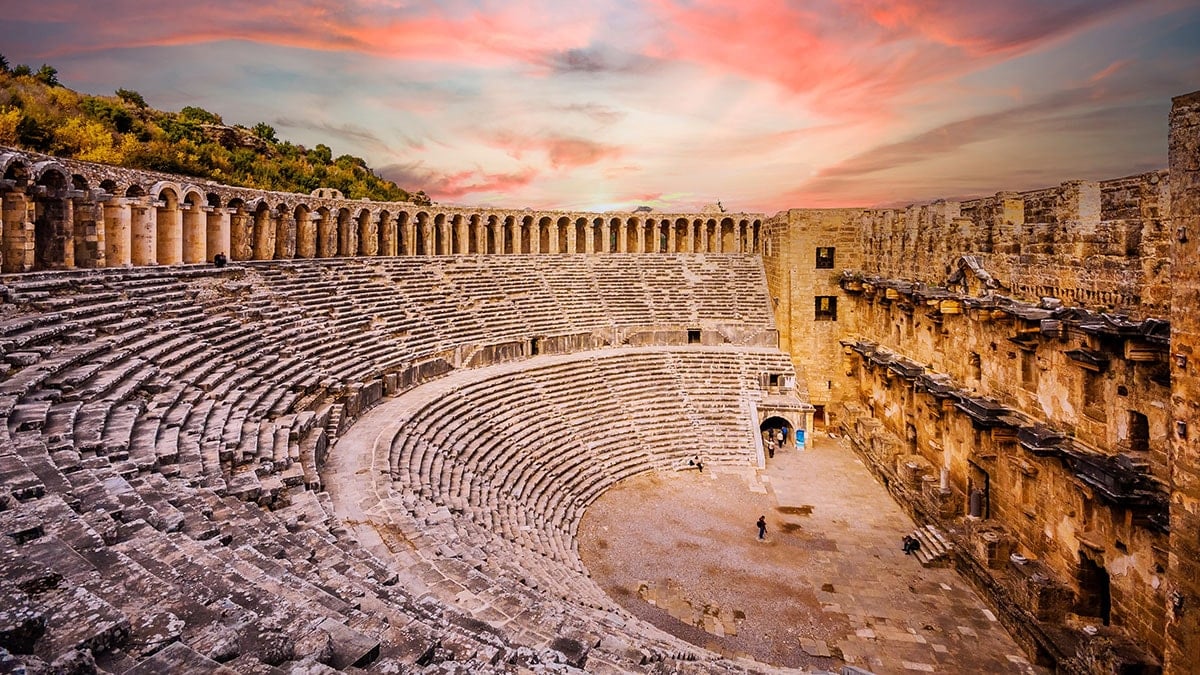 M.S. 2'nci yüzyılda inşa edilen tiyatro, 15 bin kişilik kapasitesiyle dönemin en büyük kültür yapılarından biriydi. Bugün hala orijinal akustiğini koruyor; sahnede yapılan en küçük konuşma bile üst basamaklardan duyulabiliyor. Depremler ve iklim etkilerine rağmen yapının büyük bölümü hala capcanlı duruyor.