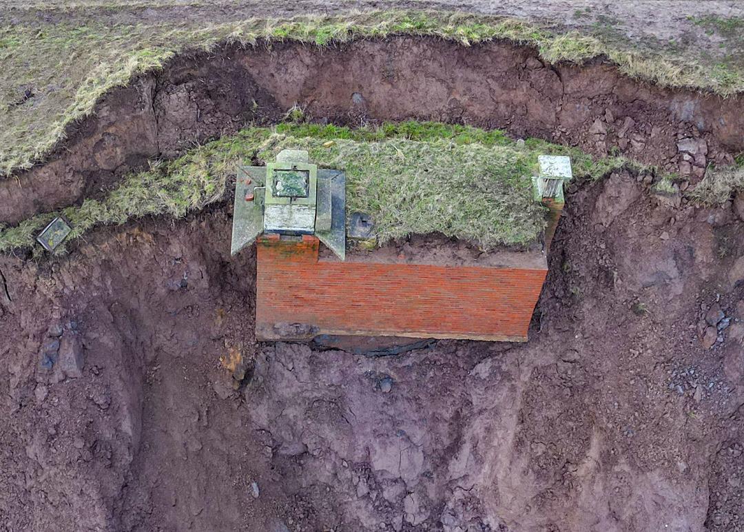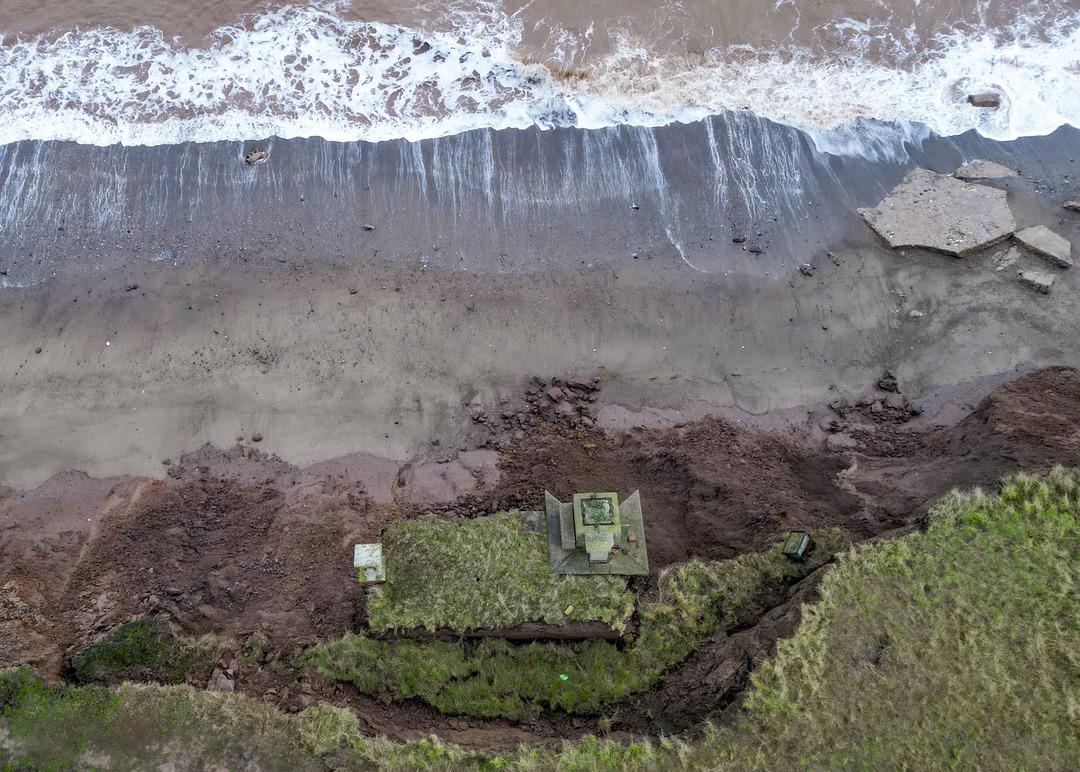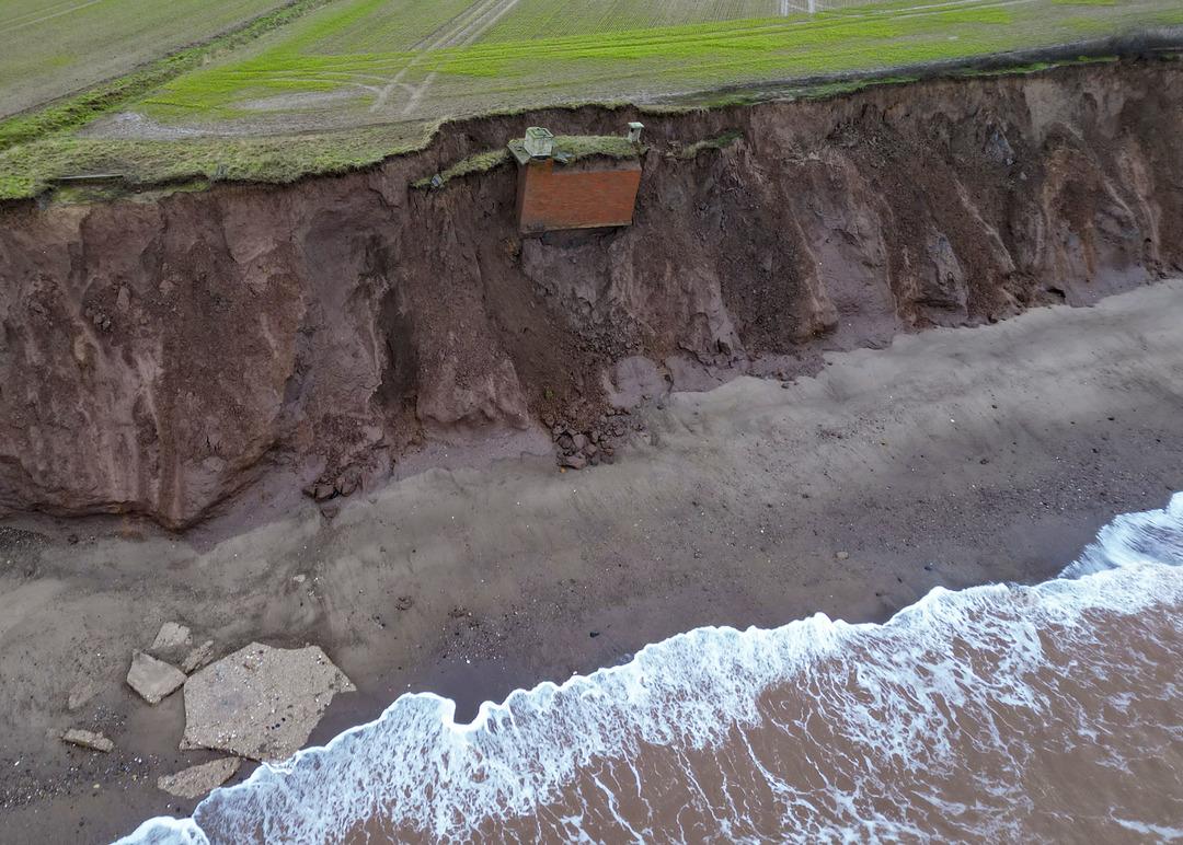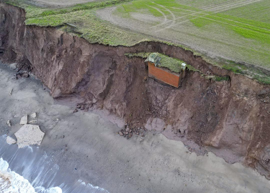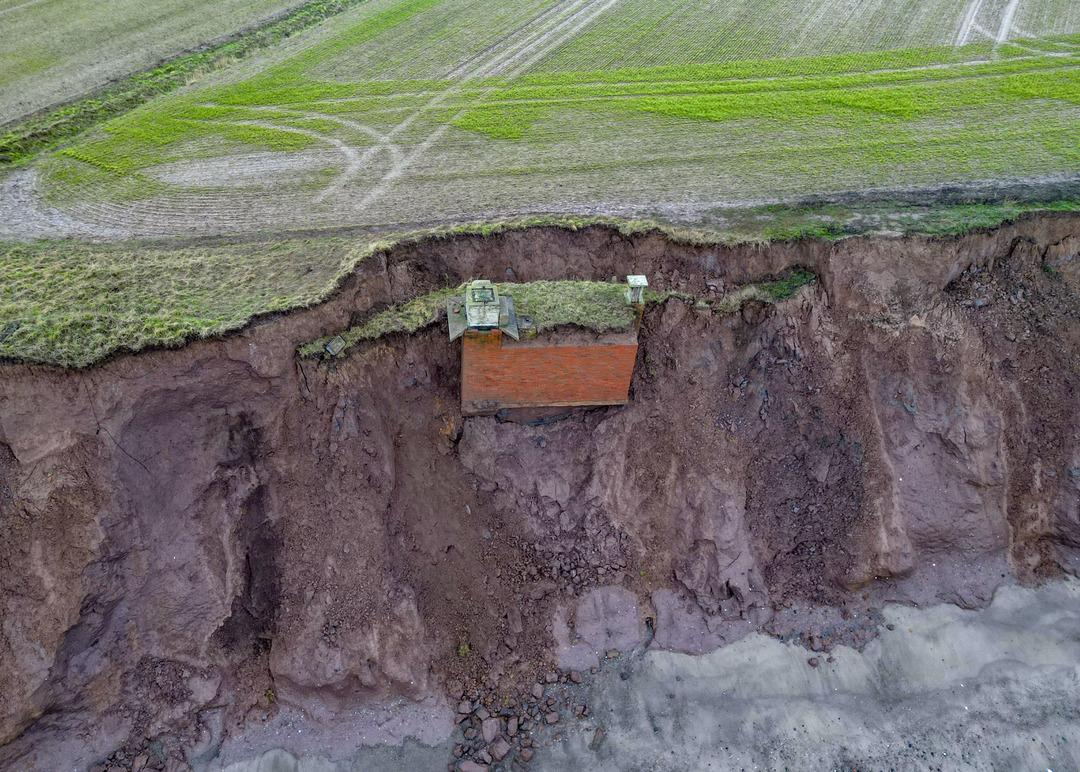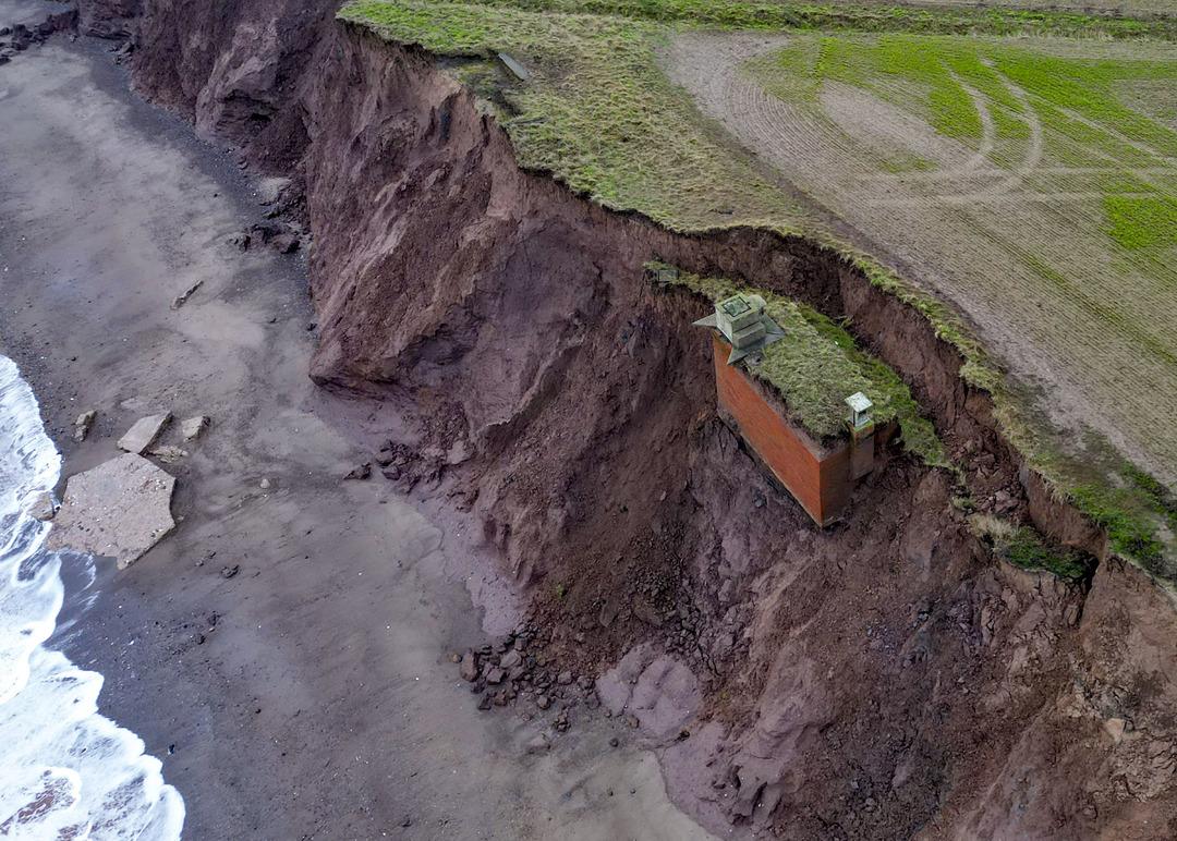 İngiltere'nin Yorkshire bölgesine bağlı Tunstall kıyılarında etkili olan erozyon, tarihi yapıları tehdit ediyor. Soğuk Savaş döneminden kalma bir nükleer sığınak, toprak kayması nedeniyle uçurumun kenarında asılı kalarak denize düşme tehlikesiyle karşı karşıya.