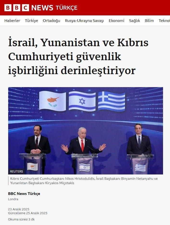 Bir gün sonra, 23 Aralık 2025’te Libya askeri heyeti Türkiye’deki yetkililerle gün boyunca görüşmeler yaptı. Aynı gün İsrail Başbakanı Netanyahu; Yunanistan ve Güney Kıbrıs Rum Yönetimi liderleriyle Kudüs’te bir araya gelerek Doğu Akdeniz’de güvenlik alanındaki iş birliklerini derinleştirme kararı aldıklarını tüm dünyaya duyurdu. Toplantıda, "Birlikte güç yoluyla istikrarı, güç yoluyla refahı ve en önemlisi güç yoluyla barışı getireceğiz," ifadeleri kullanıldı.