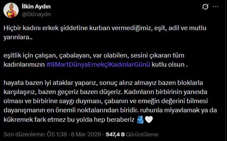 8 Mart Dünya Kadınlar Günü dolayısıyla bir paylaşım yapan Aydın, söz konus paylaşımında Karakurt'un "Ruhunla miyavla" sözlerine gönderme yaparak şu ifadeleri kullandı: