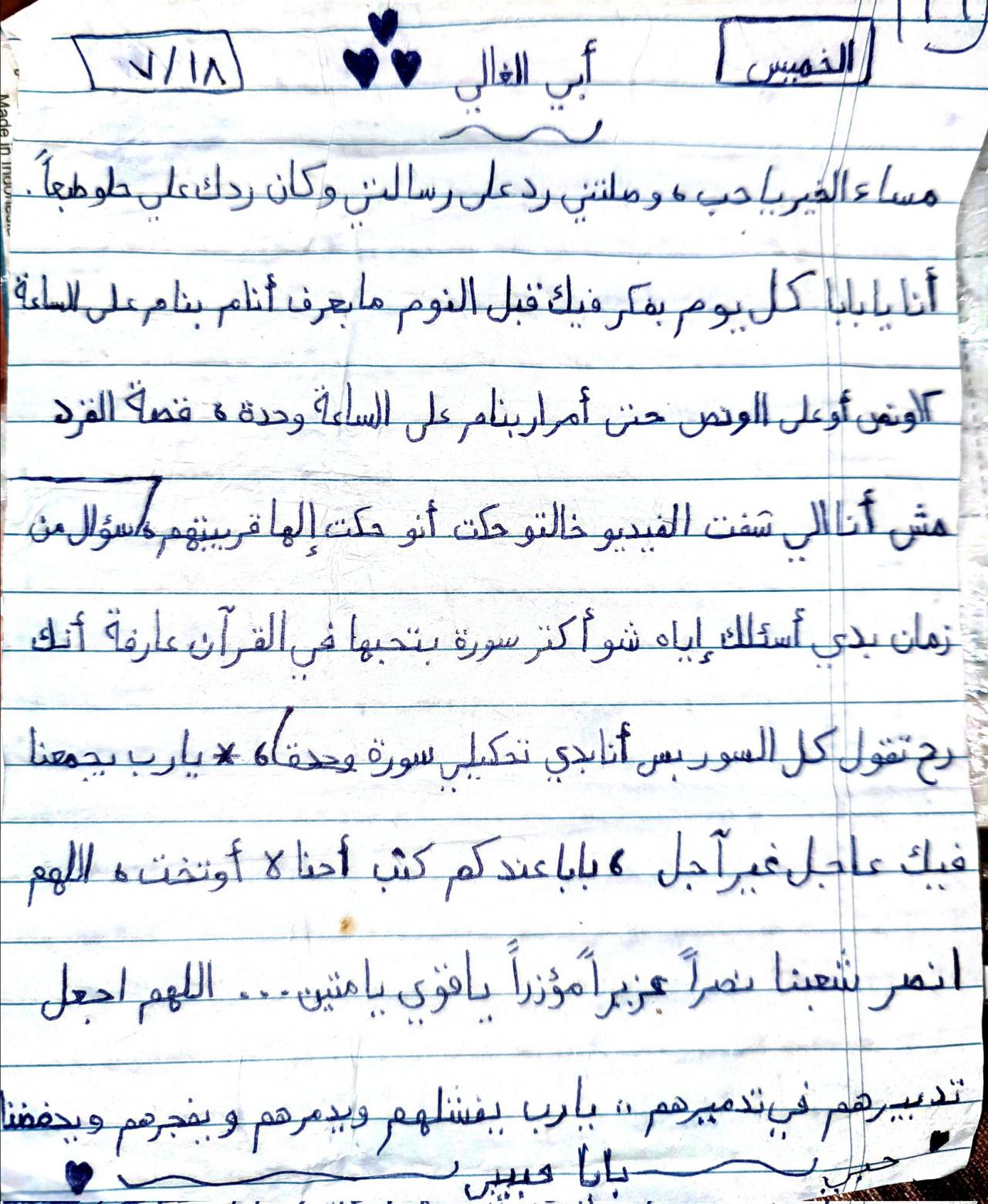 “İyi akşamlar babacığım, mektubuma verdiğin cevap bana ulaştı ve cevabın gerçekten çok güzeldi. Babacığım, ben her gün uyumadan önce seni düşünüyorum. Uyumakta zorlanıyorum. Bu arada bahsettiğim Maymun hikayesinin videosunu ben izlemedim, teyzem anlattı. Uzun zamandır sana sormak istediğim bir soru var: Kur’an’da en sevdiğin sure hangisi? Biliyorum, hepsini seviyorum diyeceksin ama yine de senden en sevdiğini duymak istiyorum. Allah’ım bizi sana bir an önce kavuştursun, gecikmeden.”