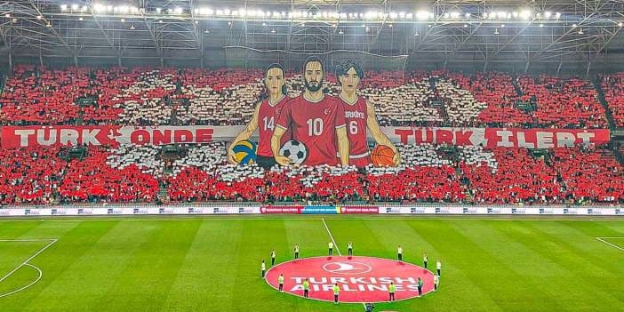 Maç başlamadan hemen önce "Türk önde, Türk ileri" yazısının arasından dev bir pankart çıktı. Pankartta A Milli Kadın Voleybol Takımı Kaptanı Eda Erdem, A Milli Futbol Takımı Kaptanı Hakan Çalhanoğlu ve Basketbol Erkek Milli Takım Kaptanı Cedi Osman'ın fotoğrafları yer aldı.