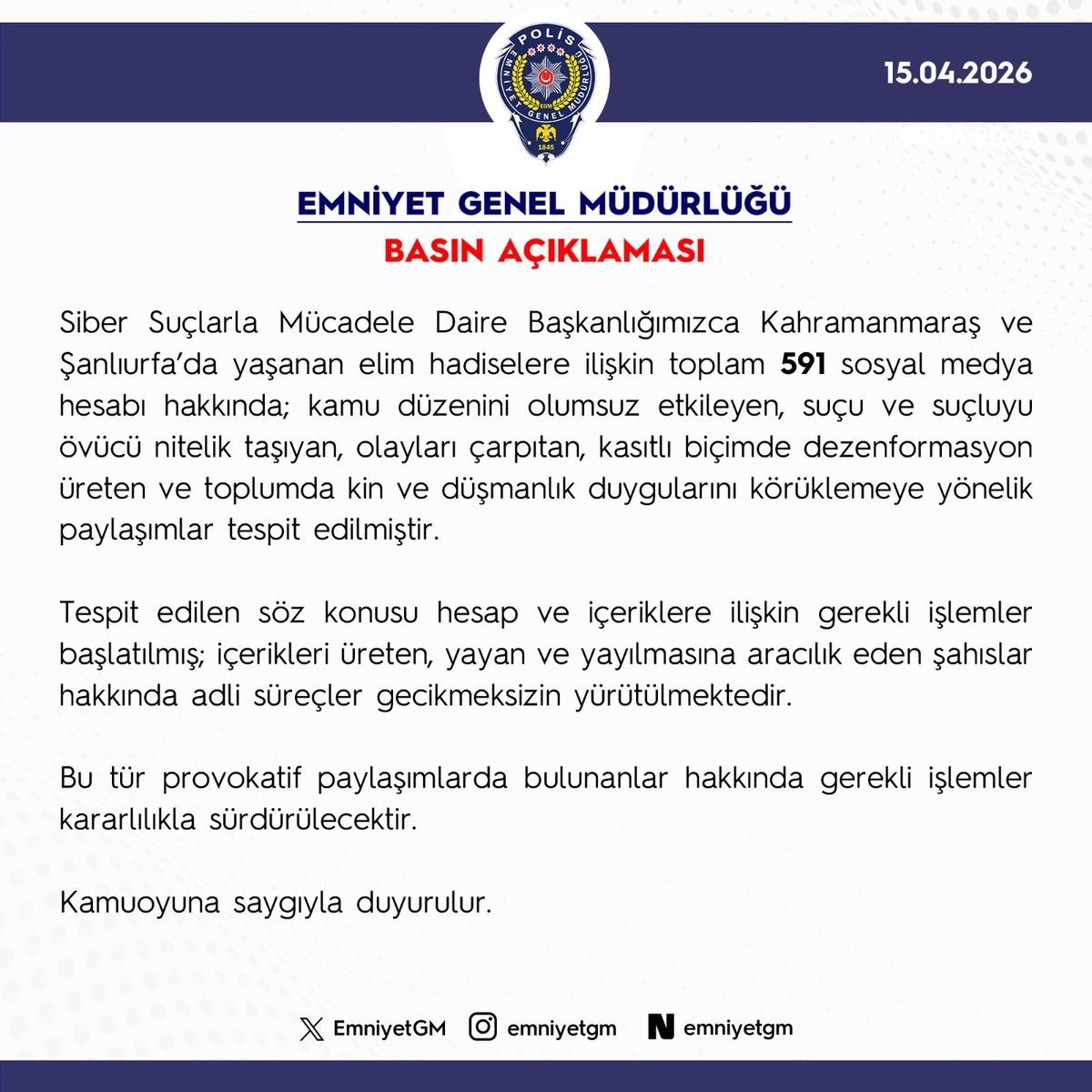 Emniyet Genel Müdürlüğü, Kahramanmaraş ve Şanlıurfa'daki saldırılarla ilgili dezenformasyon ürettiği saptanan 591 sosyal medya hesabı hakkında işlem başlatıldığını bildirdi.