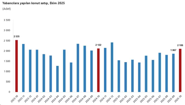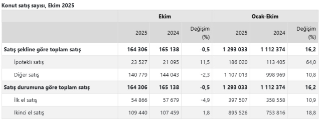 Türkiye İstatistik Kurumu (TÜİK), Ekim 2025 dönemine ilişkin konut satış istatistiklerini açıkladı. Buna göre; Türkiye genelinde konut satışları ekim ayında bir önceki yılın aynı ayına göre yüzde 0,5 oranında azalarak 164 bin 306 oldu.