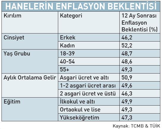 Kadınların enflasyon beklentilerinin erkeklere kıyasla daha yüksek olduğunu görüyoruz. Çarşı ve pazar işlerini genelde kadınlar yaptıkları için onların beklentilerinin bir tık daha kötümser olması normal. Asgari ücret ve altı gelire sahip olan hanelerin enflasyon beklentisi yüzde 49.5 iken, iki asgari ücret ve üzeri grubun beklentisi yüzde 46 seviyesinde. Haneler, fiyatların en çok gıda ile yakıt ve enerji grubunda artacağını düşünüyorlar. Kira ise üçüncü sırada yer alıyor.