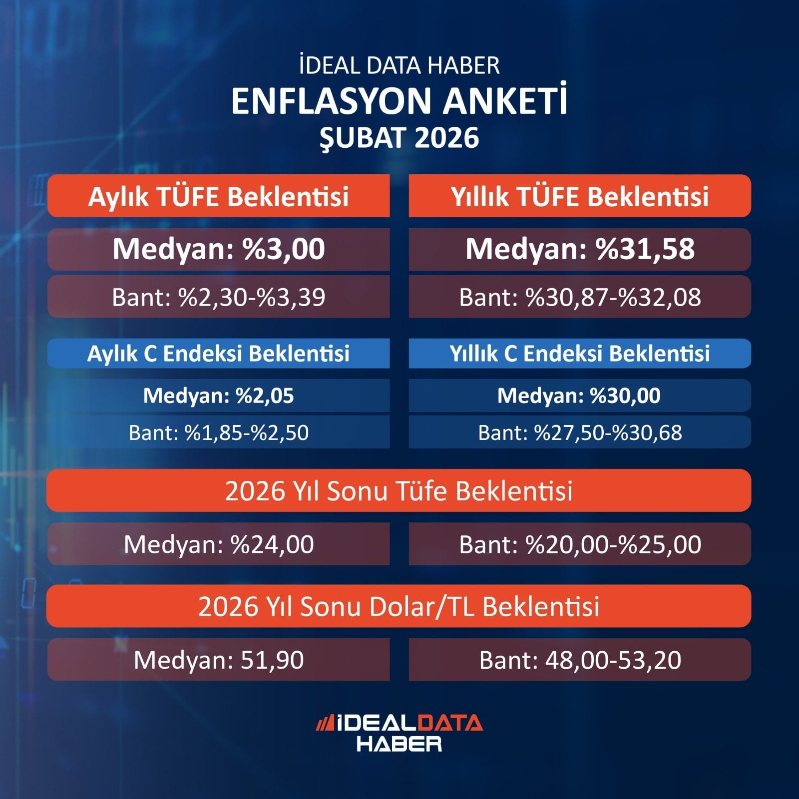 İdeal Data Haber'in 20 kurum/ekonomist ile gerçekleştirdiği anket sonuçlarına göre, şubat ayı yıllık TÜFE verisi için medyan tahmin yüzde 31,58, ortalama tahmin yüzde 31,51 artış yönünde gerçekleşti. Yıllık tahminlerde en yüksek ve en düşük oranlar sırasıyla yüzde 32,08 ve yüzde 30,87 oldu.