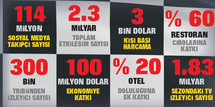 Ev sahibi ülkelere milyarlarca dolarlık ekonomik etki yaratma potansiyeline sahip, devasa bir organizasyon olan Formula 1'in (F1) yeniden İstanbul Park'ta düzenlenecek olması, turizmden perakendeye pek çok sektörde hareketlilik yaratacak. Dünyanın en prestijli spor organizasyonlarından biri olan Formula 1 kapsamında, 2027 yılından itibaren İstanbul Park'ta 5 sezon boyunca gerçekleştirilecek Türkiye Grand Prix'sinin milyonlarca izleyiciyi ülkemize yönlendirmesi bekleniyor. Kişi başı ortalama 3 bin dolardan fazla harcama yapan üst gelir grubunun takip ettiği Formula 1, turizmden perakende ve yeme-içme sektörüne kadar birçok alanda ciddi bir hareketlilik yaratacak. En son 2021 yılında Türkiye'de düzenlenen etkinlik 100 milyon dolarlık katkı sağlamıştı. F1'in 2027'de 100 milyon doları aşan bir ekonomik hareketlilik yaratması bekleniyor.