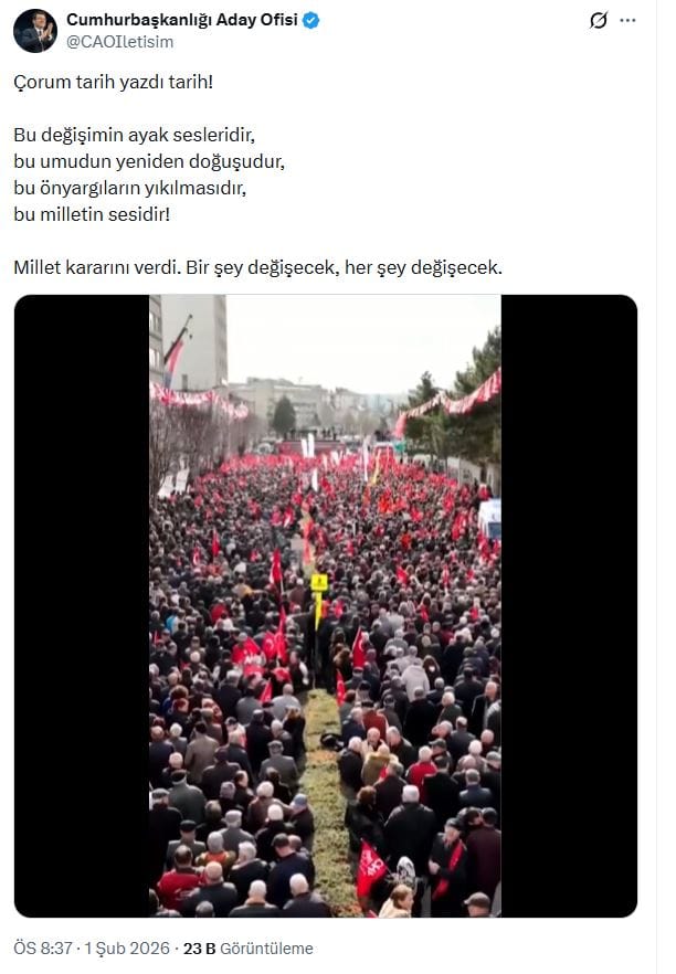 Ekrem İmamoğlu'nun Cumhurbaşkanlığı Aday Ofisi sosyal medya X hesabı paylaşımı (1 Şubat 2026)"ÇORUM TARİHİNİN EN BÜYÜK MİTİNGİ"Cumhurbaşkanı adayı ve İstanbul Büyükşehir Belediye Başkanı Ekrem İmamoğlu’na özgürlük ve erken seçim talebiyle Mart 2025’ten bu yana her hafta gerçekleştirilen "Millet İradesine Sahip Çıkıyor" mitinglerinin 86’ncısı olan Çorum buluşmasında Özgür Özel bugün on binlere seslenmişti. Özel konuşmasının bir bölümünde şu ifadelere yer vermişti: