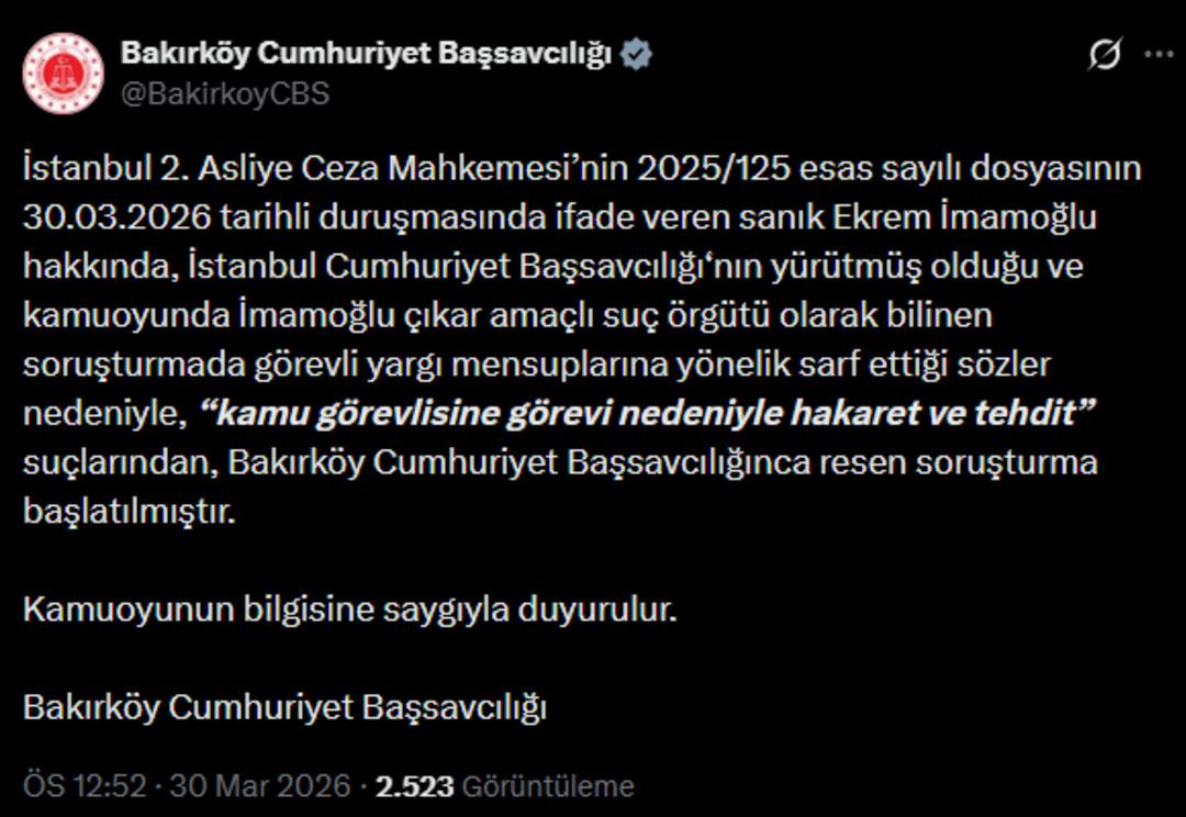 "İstanbul 2. Asliye Ceza Mahkemesi’nin 2025/125 esas sayılı dosyasının 30.03.2026 tarihli duruşmasında ifade veren sanık Ekrem İmamoğlu hakkında, İstanbul Cumhuriyet Başsavcılığı‘nın yürütmüş olduğu ve kamuoyunda İmamoğlu çıkar amaçlı suç örgütü olarak bilinen soruşturmada görevli yargı mensuplarına yönelik sarf ettiği sözler nedeniyle, “kamu görevlisine görevi nedeniyle hakaret ve tehdit” suçlarından, Bakırköy Cumhuriyet Başsavcılığınca resen soruşturma başlatılmıştır.