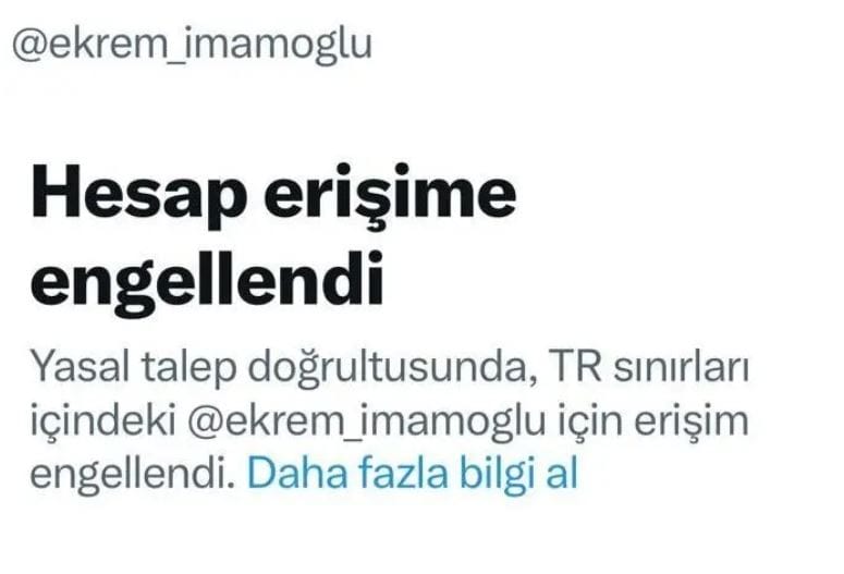 Tutuklu Cumhurbaşkanı Adayı ve İBB Başkanı Ekrem İmamoğlu'nun, yüzbinlerce takipçiye sahip Cumhurbaşkanlığı Aday Ofisi hesabı hakkında da erişim engeli kararı verildi.
