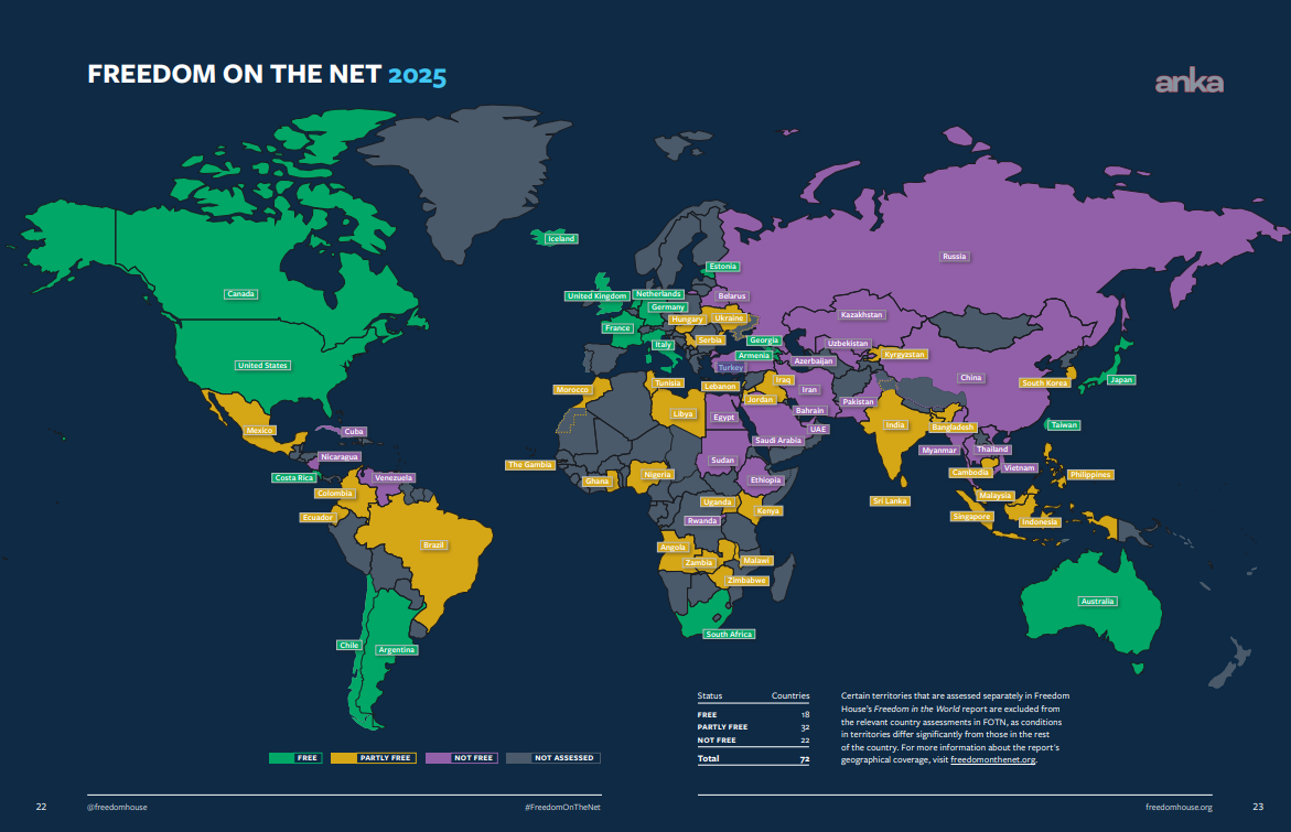 Uluslararası insan hakları kuruluşu Freedom House; Kian Vesteinsson ve Grant Baker tarafından hazırlanan 2025 İnternette Özgürlük Raporu'nu yayınladı. 72 ülkedeki internet özgürlüğüne ilişkin değerlendirmelerin yer aldığı raporda, bu yıl internetin 18 ülkede özgür, 32 ülkede kısmen özgür ve 22 ülkede özgür olmadığı belirtildi.