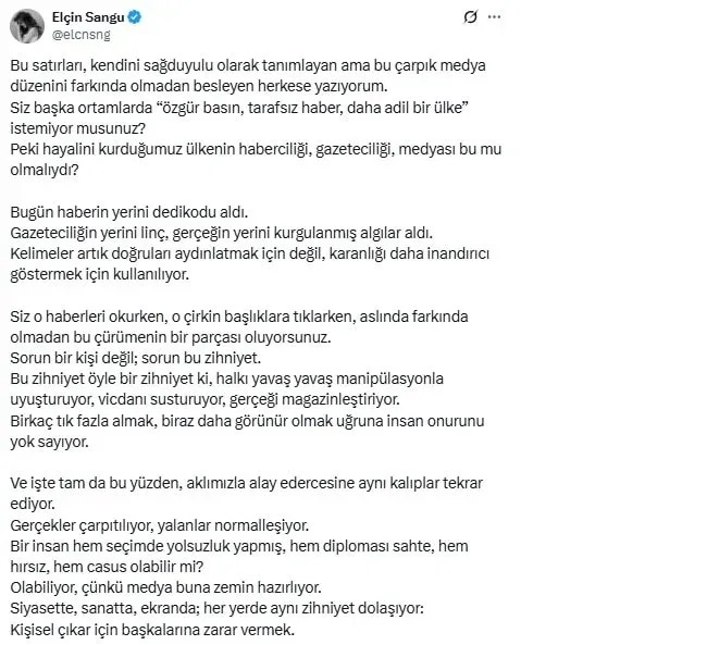 "BU ÇÜRÜMENİN BİR PARÇASI OLUYORSUNUZ""Bu satırları, kendini sağduyulu olarak tanımlayan ama bu çarpık medya düzenini farkında olmadan besleyen herkese yazıyorum. Siz başka ortamlarda 'özgür basın, tarafsız haber, daha adil bir ülke' istemiyor musunuz? Peki hayalini kurduğumuz ülkenin haberciliği, gazeteciliği, medyası bu mu olmalıydı?