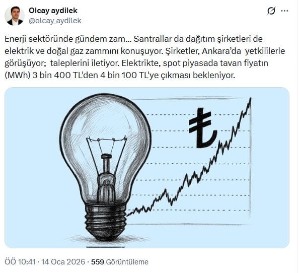 Aydilek'in sosyal medya platformu X hesabından yaptığı paylaşımda, "Enerji sektöründe gündem zam... Santrallar da dağıtım şirketleri de elektrik ve doğal gaz zammını konuşuyor. Şirketler, Ankara’da yetkililerle görüşüyor; taleplerini iletiyor. Elektrikte, spot piyasada tavan fiyatın (MWh) 3 bin 400 TL'den 4 bin 100 TL'ye çıkması bekleniyor" ifadeleri yer aldı.