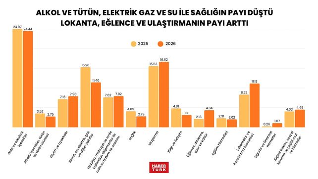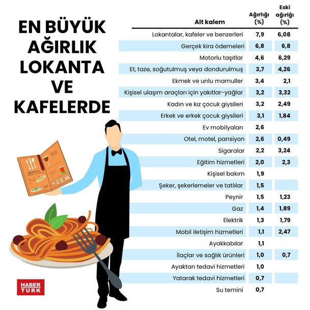 Böylece elektrik, gaz, sigara, hastane ve okul zamları enflasyonu bundan önceki döneme göre daha az etkileyecek. Sepetin yeni haliyle enflasyonu daha yukarı çekecek kalem ise lokanta ve oteller. Lokanta ve otellerin sepetteki ağırlığı yüzde 8,32’den yüzde 11,13’e yükseldi. Ulaştırmanın payı ise yüzde 15.53'den yüzde 16.62'ye tırmandı. Giyim ve ayakkabının payı da yüzde 7.16'dan yüzde 7.90'a ulaştı. Yani bundan sonra ulaştırma ve lokanta, giyim fiyat artışları enflasyonu daha fazla yukarı çekecek.