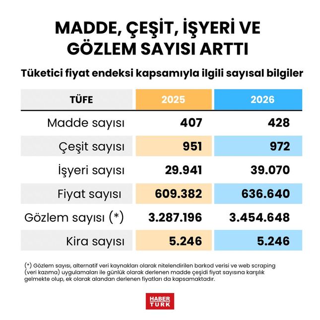 Memleketin büyük bölümü kar altında kalınca gıda enflasyonu yüzde 7.82 ile rekor düzeyde geldi. Bunun üstüne yılbaşı olması nedeniyle yapılan kira ve ulaştırma zamları da eklenince manşet enflasyon yüzde 4.84 yükseldi. Yanı sıra dün uzun süre beklenen madde sepeti ve ağırlık revizyonu da geldi. Enflasyon sepetinde gıda, alkollü içecekler ve sigara, elektrik, gaz ve su, sağlık, bilgi iletişim ile eğitimin payı azaldı. Buna karşın lokanta ve oteller, giyim ayakkabı, mobilya ve ulaştırmanın payı arttı. Revizyonun enflasyonu yukarı çeken kalemlerde ağırlık azaltımı nedeniyle enflasyon rakamına olumlu yansıması bekleniyor. Endeks artık 2025=100 oldu ve TÜFE sepeti de böylece güncellendi.
