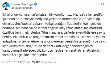 HASAN CAN KAYA: AMACIM ALAY ETMEK DEĞİLDİTartışmaların büyümesi üzerine Hasan Can Kaya bir açıklama yayımlayarak kamuoyundan özür diledi. Kaya, açıklamasında şu ifadeleri kullandı: İki yıl önce Konuşanlar'a katılan bir konuğumuzu Hz. İsa'ya benzettiğim şakadan ötürü sosyal medyada yaşanan tartışmayı üzüntüyle takip etmekteyim. Yapılan şakanın ve kullandığım ifadelerin hiçbir şekilde herhangi bir inanç ya da kutsal değerle alay etme amacı taşımadığını özellikle belirtmek isterim. Tüm inançlara, değerlere ve görüşlere saygı; benim, ekibimizin ve programımızın temel prensibidir. Benzer bir yanlış anlaşılmanın tekrar etmemesi için gereken özeni göstereceğimi ve yayın içeriklerimizi bu doğrultuda daha dikkatli değerlendireceğimizi kamuoyuna ifade eder, söz konusu hadisenin yarattığı rahatsızlık için samimi bir şekilde özür dilerim.