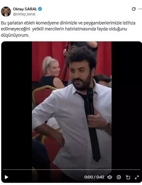 OKTAY SARAL'DAN SERT TEPKİCumhurbaşkanı Başdanışmanı Oktay Saral, görüntüleri sosyal medya hesabından alıntılayarak sert ifadeler kullandı. Saral, paylaşımında şu sözlere yer verdi: Bu şarlatan ebleh komedyene dinimizle ve peygamberlerimizle istihza edilmeyeceğini yetkili mercilerin hatırlatmasında fayda olduğunu düşünüyorum.