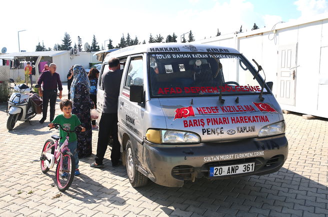 "DEPREMZEDELERİN BİR NEBZE DE OLSA RAHATLADIKLARINI HİSSETTİM" Muhammet Yılmaz, aracını, Türk bayrağı ile Türkiye'nin sınır ötesi operasyonları ve gezdiği yerlerin adlarıyla süslediğini söyledi.
