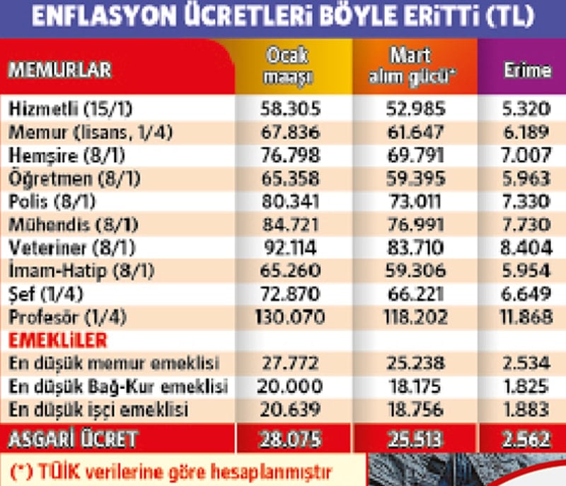 TÜİK enflasyonuna göre, bu emeklinin yılbaşında aldığı 2 bin 173 liralık zammın 1825 lirası eridi, elde sadece 348 lirası kaldı. ENAG’ın enflasyonu ise bu emeklinin elinde zam kalmadığı gibi geçen aralık ayındaki aylığının bile 454 lira altına düştüğünü ortaya koydu. En düşük memur maaşının alım gücü ENAG’a göre 7 bin 658 lira eridi.
