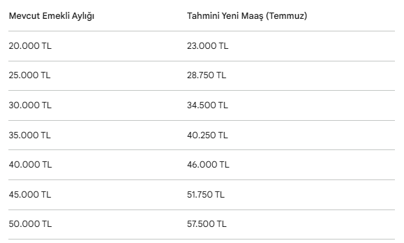 MAAŞLARA GÖRE TAHMİNİ ZAM TABLOSUErdursun'un paylaştığı yüzde 15’lik olası artış oranının maaşlara yansıması durumunda, emekli aylıklarında oluşacak yeni tablo şu şekilde öngörülüyor: