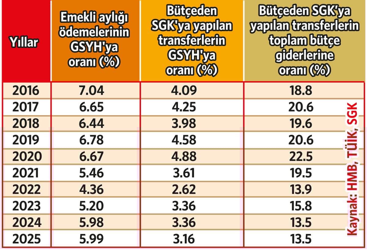 2016 yılında emekli aylığı ödemelerinin GSYH içindeki payı yüzde 7.04 seviyesindeydi. 2025 yılına gelindiğinde, emekli sayısı 5 milyon artmasına rağmen bu pay yüzde 5.99’a geriledi.