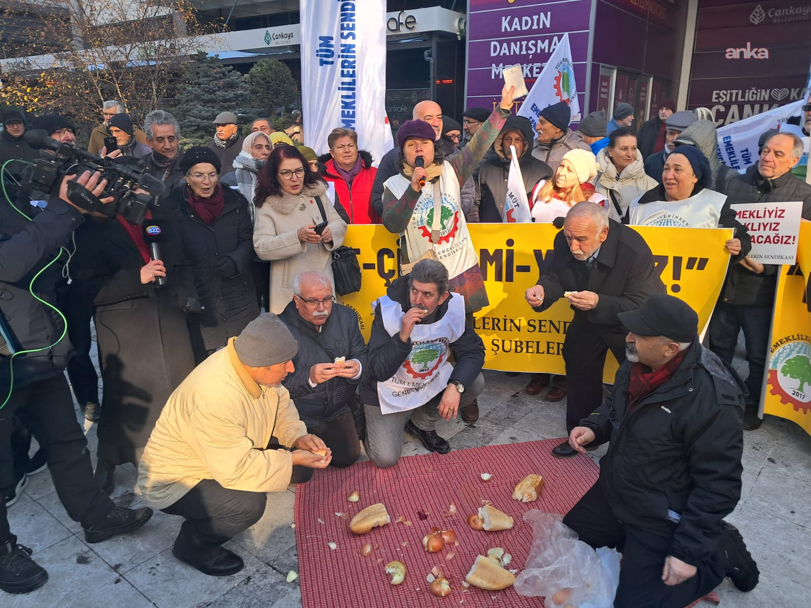 Tüm Emeklilerin Sendikası Ankara Şubeleri, 2026'nın ilk yarısında emeklilere yapılması planlanan zam oranlarını protesto etmek için Sakarya Caddesi’nde açıklama yaptı; emekliler, artan hayat pahalılığına dikkat çekmek amacıyla basın açıklamasının ardından kuru soğan ve ekmek yiyerek geçim sıkıntısına tepki gösterdi.