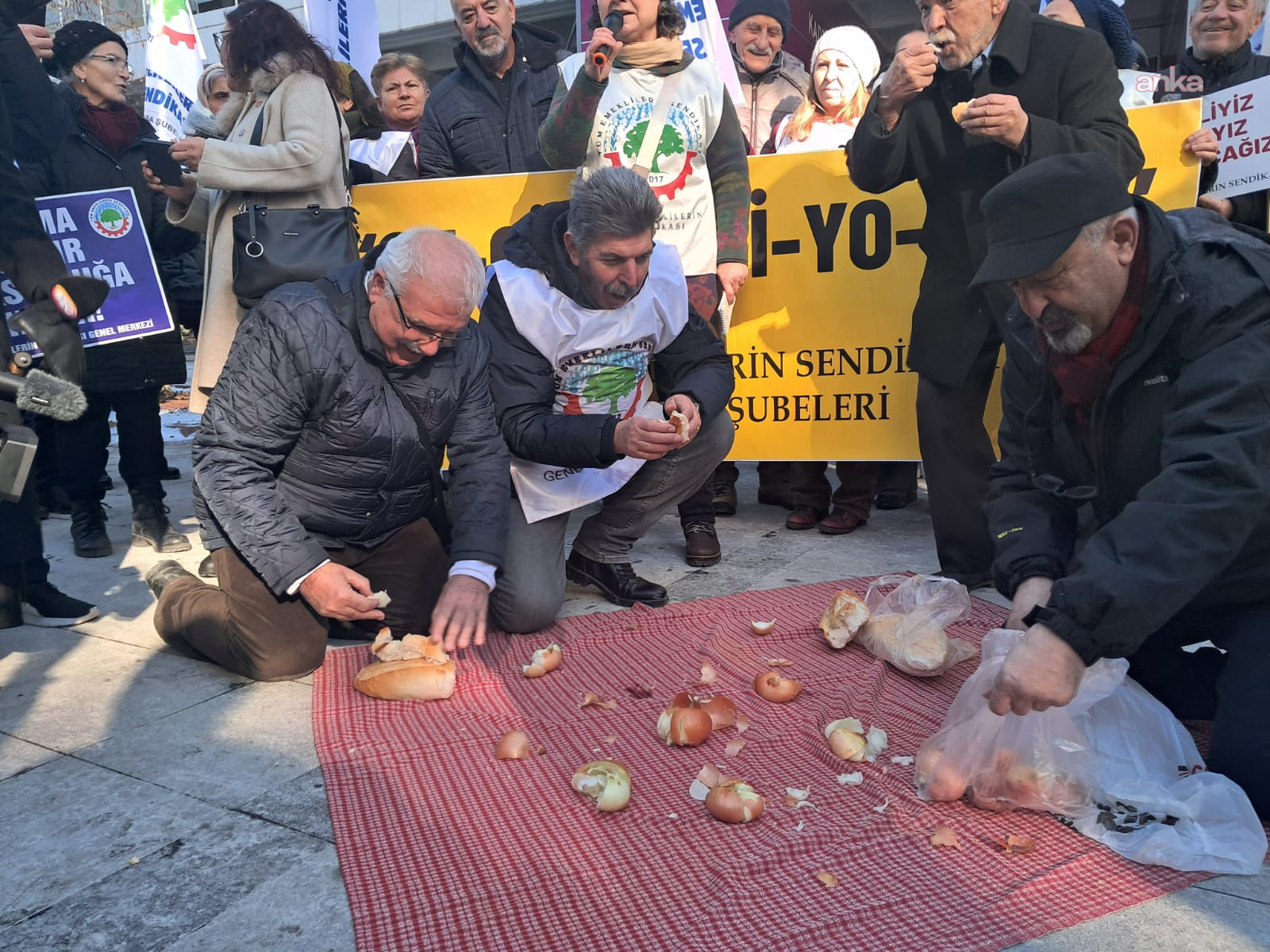 Emekliler basın açıklamasının ardından, geçim koşullarına dikkat çekmek amacıyla kuru soğan ve ekmek yedi. Emekliler, artan hayat pahalılığı karşısında temel gıdaya dahi erişimin zorlaştığını belirterek, kuru soğan ve ekmekle geçinmeye mahkum edildiklerini ifade etti.