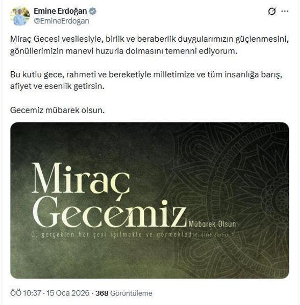 Emine Erdoğan, sanal medya hesabından paylaştığı mesajda, "Miraç Gecesi vesilesiyle, birlik ve beraberlik duygularımızın güçlenmesini, gönüllerimizin manevi huzurla dolmasını temenni ediyorum. Bu kutlu gece, rahmeti ve bereketiyle milletimize ve tüm insanlığa barış, afiyet ve esenlik getirsin. Gecemiz mübarek olsun" dedi.