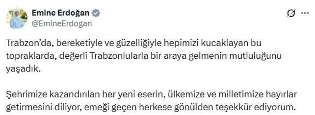 Trabzon'a, yapımı tamamlanan tesis ve projelerin açılış töreni için giden Cumhurbaşkanı Erdoğan'a eşlik eden Emine Erdoğan, sosyal medya hesabından yaptığı paylaşımda, "Trabzon'da, bereketiyle ve güzelliğiyle hepimizi kucaklayan bu topraklarda, değerli Trabzonlularla bir araya gelmenin mutluluğunu yaşadık.