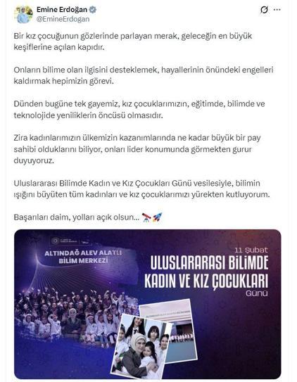 Emine Erdoğan, sanal medya hesabından yaptığı paylaşımda, "Bir kız çocuğunun gözlerinde parlayan merak, geleceğin en büyük keşiflerine açılan kapıdır. Onların bilime olan ilgisini desteklemek, hayallerinin önündeki engelleri kaldırmak hepimizin görevi. Dünden bugüne tek gayemiz, kız çocuklarımızın, eğitimde, bilimde ve teknolojide yeniliklerin öncüsü olmasıdır. Zira kadınlarımızın ülkemizin kazanımlarında ne kadar büyük bir pay sahibi olduklarını biliyor, onları lider konumunda görmekten gurur duyuyoruz. Uluslararası Bilimde Kadın ve Kız Çocukları Günü vesilesiyle, bilimin ışığını büyüten tüm kadınları ve kız çocuklarımızı yürekten kutluyorum. Başarıları daim, yolları açık olsun" ifadelerini kullandı.