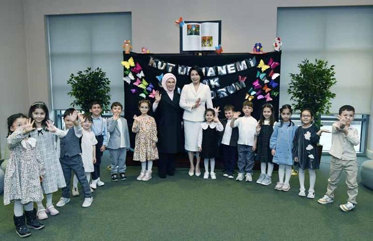 Emine Erdoğan ve Kim, Nasreddin Hoca Çocuk Kütüphanesi'ne geçerek buradaki çocuklarla da bir araya geldi. Kim, kendisini 'Hoş geldiniz' diye karşılayan çocuklara, 'Merhaba' diyerek karşılık verdi. Atık malzemelerden figürünü yaptıkları Tulumtaş Mağarası'nın özelliklerini anlatan çocuklar, Emine Erdoğan ve Kim ile mağaranın sarkıt ve dikitlerine eklemeler yaptı. Lider eşlerine pusula deneyini gösteren çocuklar, mozaik üzerine de Piri Reis haritasının görselini işledi. Emine Erdoğan ve Kim, yaptıkları etkinlikleri ilgiyle izledikleri çocuklarla hatıra fotoğrafı çektirdi.