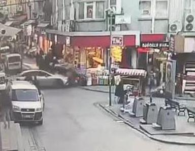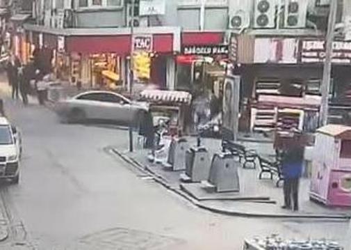 Kaza anı ise saniye saniye iş yerlerinin güvenlik kameralarına yansıdı. Otomobilin önce durup sonra aniden hareket ederek motosiklete ardından valizlere ve yayalara çarpması ve yayaların yola savrulması saniye saniye kameralara yansıdı.