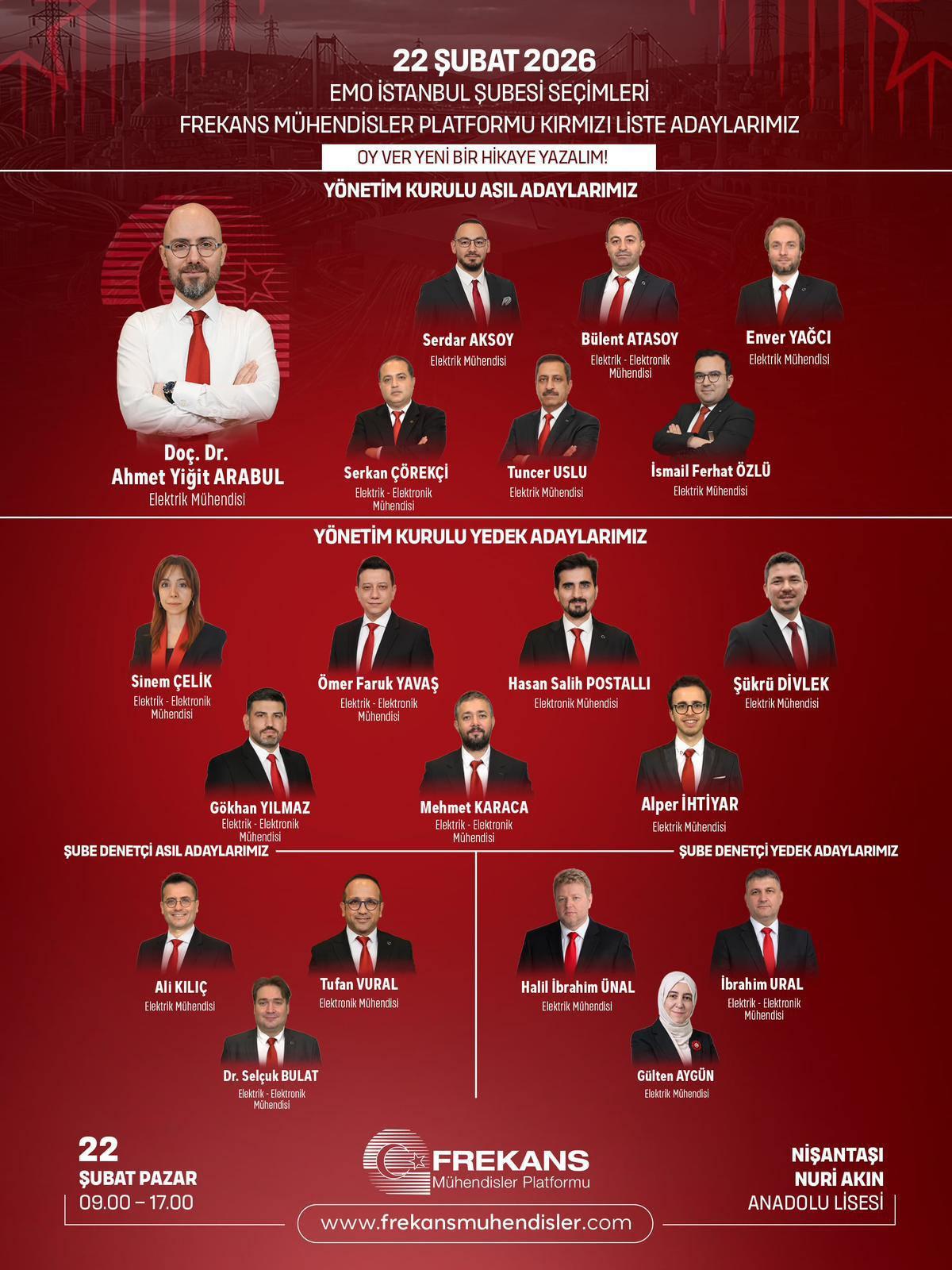 Cumhuriyetin ikinci yüzyılında mesleğin, ülkenin kalkınma iradesindeki taşıyıcı rolüne dikkat çeken Arabul, tüm meslektaşlarını 22 Şubat Pazar günü Nişantaşı Nuri Akın Anadolu Lisesi'nde kurulacak sandıklarda Frekans Mühendisler Platformu öncülüğündeki Kırmızı Liste'ye oy vererek ortak akıl ve liyakat hareketine destek olmaya çağırdı.