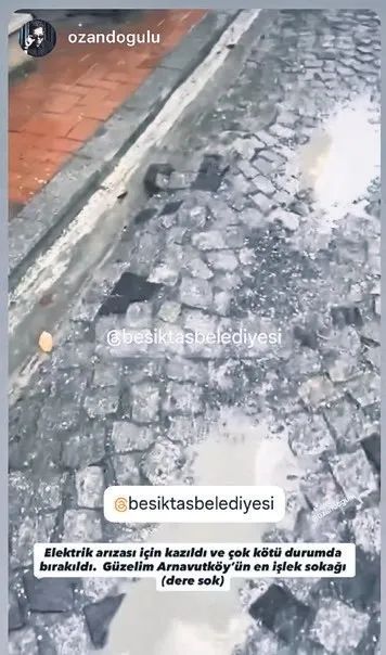 "Elektrik arızası için kazıldı ve çok kötü durumda bırakıldı. Güzelim Arnavutköy'ün en işlek sokağı (Dere Sok.)" Sanatçının paylaşımı kısa sürede sosyal medyada ilgi görürken, bölge sakinleri de benzer şikâyetlerini dile getirdi. Özellikle Arnavutköy gibi yoğun yaya trafiğinin olduğu bir bölgede yolun bu şekilde bırakılmasının hem görüntü kirliliği yarattığı hem de güvenlik açısından risk oluşturduğu yorumları yapıldı. Vatandaşlar, ilgili ekiplerin kısa sürede bölgede onarım çalışması yapmasını bekliyor.