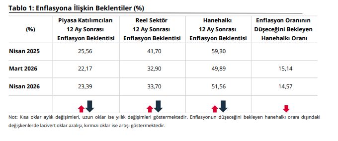 Buna göre, nisanda 12 ay sonrası yıllık enflasyon beklentileri geçen aya göre, piyasa katılımcıları için 1,22 puan artarak yüzde 23,39 seviyesine, reel sektör için 0,8 puan artarak yüzde 33,70 seviyesine, hane halkı için 1,67 puan artarak yüzde 51,56 seviyesine çıktı.