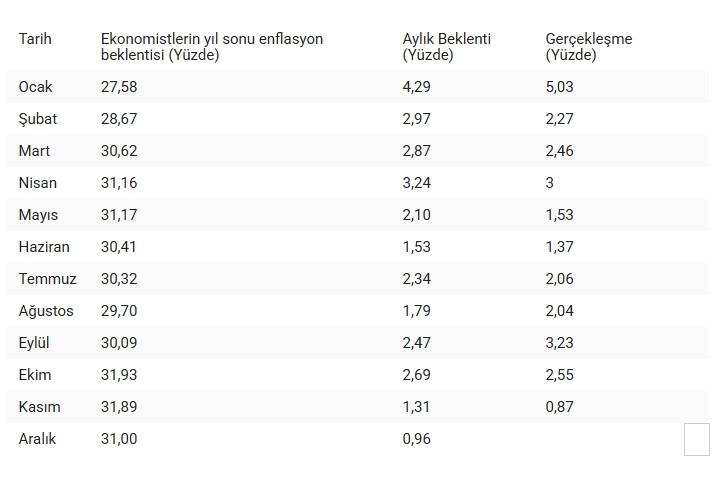 Ekonomistlerin aralık ayı enflasyon beklentilerinin ortalamasına göre (yüzde 0,96) bir önceki ay yüzde 31,07 olan yıllık enflasyonun aralıkta yüzde 31'e ineceği öngörülüyor.