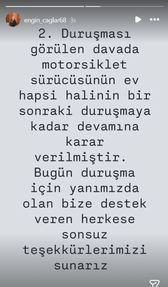 Engin Çağlar'ın ölümüne ilişkin ikinci duruşma ise bugün yapıldı. Duruşma sonrası açıklama yapan Çağlar ailesi, "2. duruşması görülen davada, motosiklet sürücüsünün ev hapsi halinin bir sonraki duruşmaya kadar devamına karar verilmiştir. Bugün yanımızda olan ve bize destek veren herkese sonsuz teşekkür ederiz" ifadelerini paylaştı.