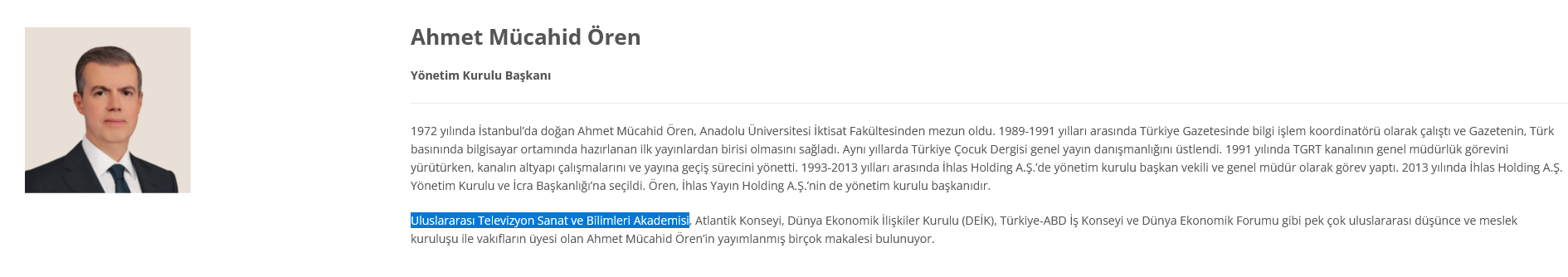 İhlas Holding’in sitesinde yer alan biyografiye göre Ahmet Mücahit Ören’in, yazışmalarda adı geçen Uluslararası Televizyon Sanat ve Bilimleri Akademisi’ne üye olduğu görüldü.