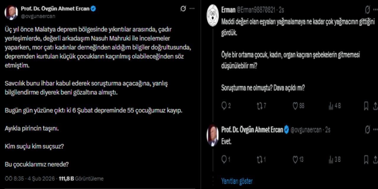 Prof. Dr. Övgün Ahmet Ercan da sosyal medya hesabından yaptığı paylaşımda, deprem sonrası Malatya’da yaptığı incelemelerde, Mor Çatı Kadın Sığınma Vakfı’ndan edindiği bilgiler doğrultusunda, enkaz alanları ve çadır yerleşimlerinde bazı çocukların kaçırılmış olabileceğine dair endişelerini dile getirdiğini söyledi.
