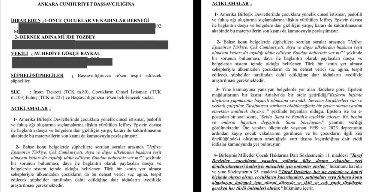 Suç duyurusunda Epstein'ın kurduğu ağın mağdurlarının Antalya'daki bir otele getirildiğinin ifade edildiği belgelere işaret eden dernek, depremde kaybolan çocukların yurt dışına kaçırıldığına dair iddiaları da hatırlattı.