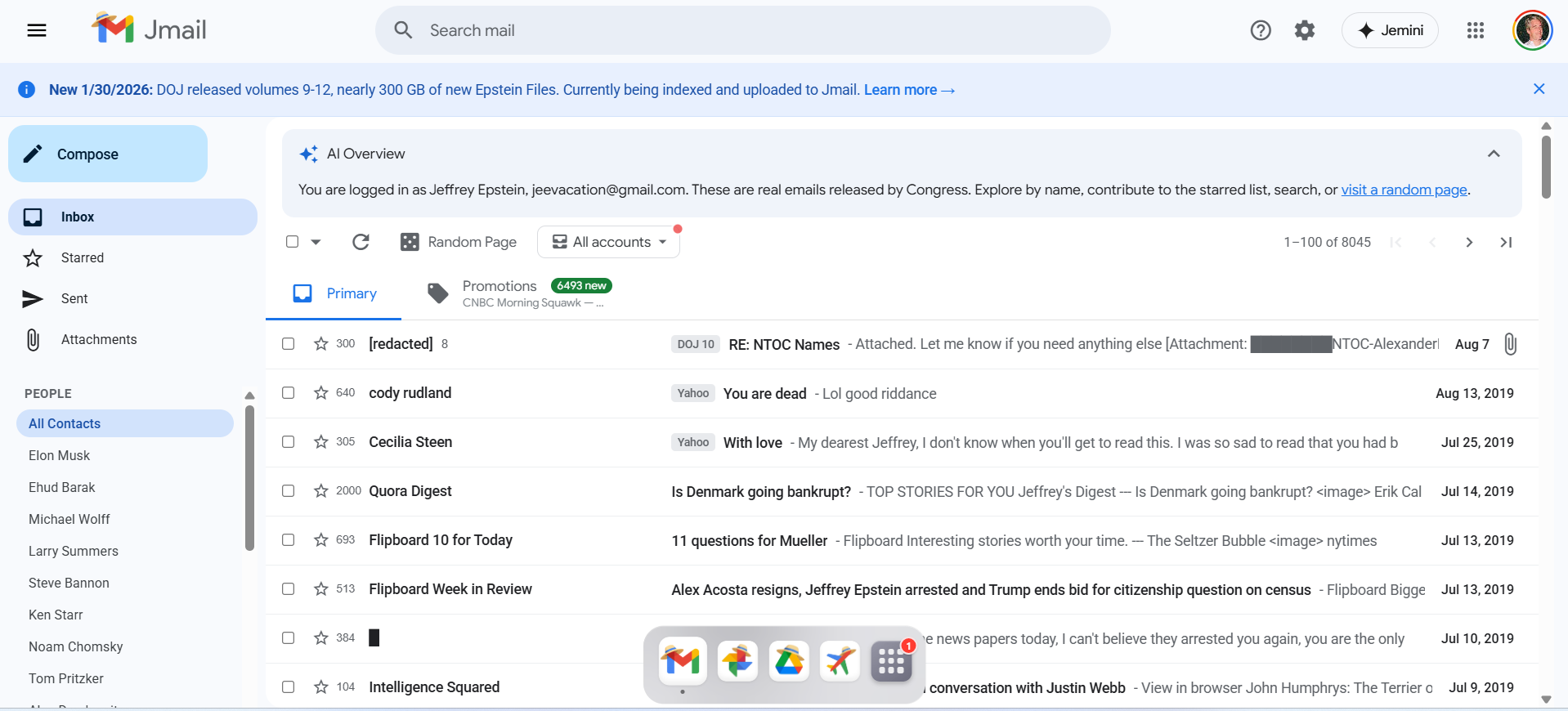 Öte yandan platformda yer alan bilgilere göre, 30 Ocak 2026'ta Adalet Bakanlığı tarafından yayımlanan 9–12'nci ciltler (yaklaşık 300 GB veri) halen indekslenme aşamasında ve 'Jmail' sistemine yükleniyor.
