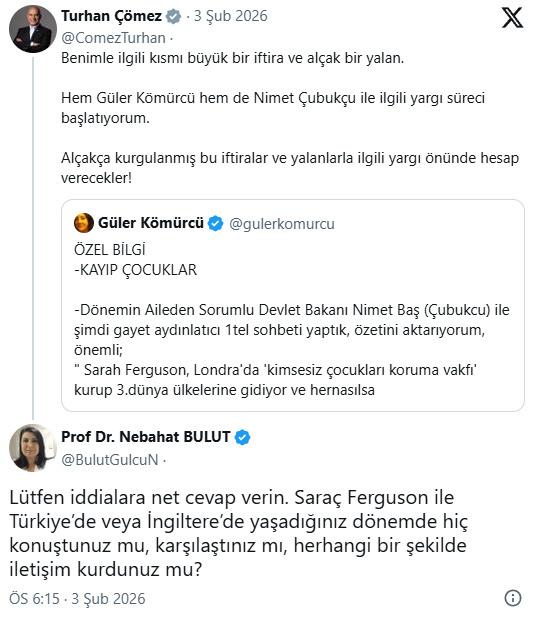 ÇÖMEZ: İFTİRA VE ALÇAK BİR YALANİddiaların odağındaki isim Turhan Çömez, sosyal medyada yaptığı açıklamada, kendisiyle ilgili bölümün “alçakça kurgulanmış bir iftira” olduğunu belirterek hem Güler Kömürcü hem de Nimet Çubukçu hakkında yargı süreci başlatacağını duyurdu.
